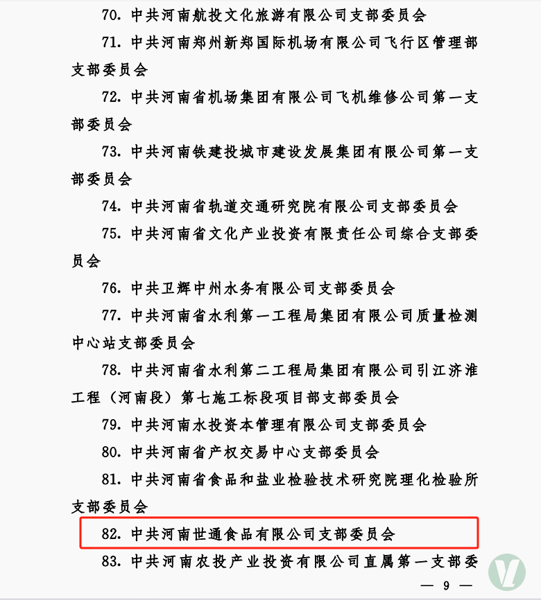 世通食品公司黨支部認真貫徹集團黨委決策部署,以“三化三提升”為組織建設總抓手,堅持“謀經營抓黨建、強黨建促經營”方針,積極開展“黨建+”活動,推進落實“雙五工程”,著力打造學習型、服務型、創新型基層黨組織,相繼獲得國家級“高新技術企業”、河南省“農業產業化省重點龍頭企業”、“河南省綠色豆制品加工裝備工程技術研究中心”、“中國豆制品行業50強企業”、“質量安全示范單位”、河南省“專精特新企業”、河南省糧食行業“十大知名品牌”、省管企業標準化黨支部、先鋒黨支部、鄭州市工程技術研究中心等榮譽。此次獲得省管企業“五星”黨支部榮譽稱號,不僅是對世通公司黨員干部以及全職工取得成績的肯定,更為集團其他黨支部創建工作提供了樣本,樹立了標桿。